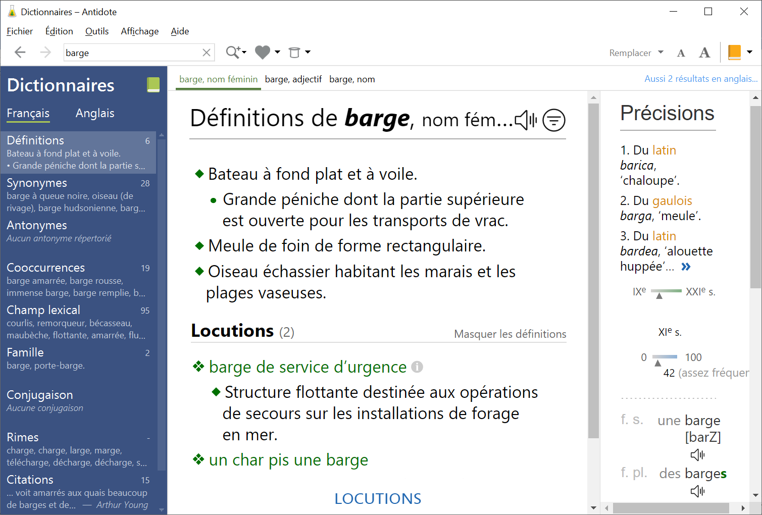 Des dictionnaires multiples avec recherche puissante : lisez la définition complète de votre mot et des expressions et proverbes où il figure ; voyez son pluriel, sa prononciation, ses rimes et son étymologie. D'un seul clic, consultez la liste de ses synonymes, de ses antonymes, des mots de même famille. Découvrez son champ lexical, ses citations, ses illustrations, sa conjugaison complète, son évolution historique ou encore l'univers de ses cooccurrences, et appréciez l'interaction intelligente entre tous ces ouvrages. Avec sa richesse incomparable, ses puissants moteurs de recherche et sa vitesse foudroyante, Antidote repousse les limites des dictionnaires du français.