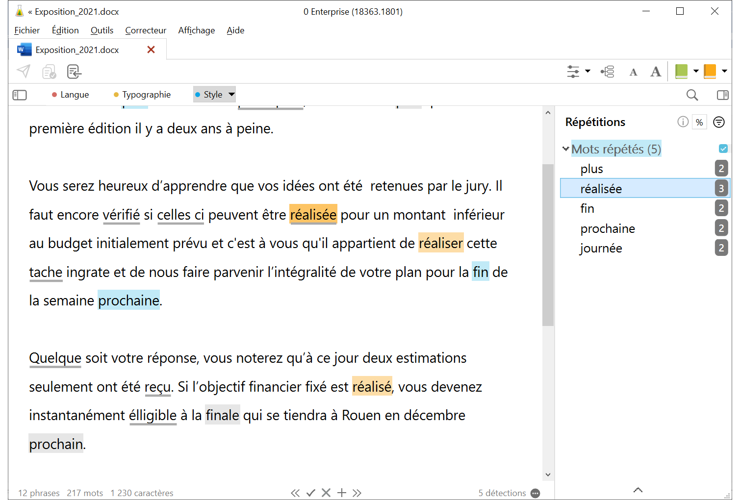 Cliquez sur les filtres et voyez votre texte sous tous ses angles, de la pragmatique (qui, quand, où, combien) au style (phrases longues, verbes absents...). Ici, le filtre des répétitions surligne les redites potentielles.