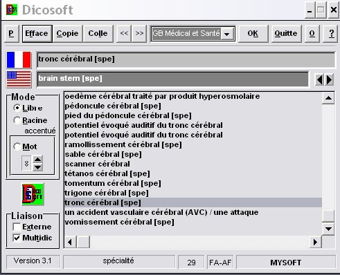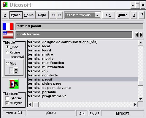 Les Grand Bilingue proposent trois modes de recherche afin de s'adapter aux besoins différents qui surgissent dans une traduction. Le mode "libre" : le plus adapté pour trouver la traduction des expressions. Est-ce que printing data receiver se trouve à la rubrique printing ou data ou receiver ? Peu importe : vous tapez les mots dans l'ordre que vous désirez et toutes les expressions les contenant apparaissent immédiatement à l'écran. Le mode "racine" : le plus rapide pour trouver un mot simple. Nul besoin de le taper en entier : écrivez ses premières lettres et tous les mots et expressions commençant par celles-ci sont sélectionnés. Cliquez sur celui ou celle qui vous convient pour connaître sa traduction. Le mode "mot" : outil plus spécifique, il extrait toutes les expressions contenant un mot donné. On peut paramétrer la taille maximale de l'expression entre 1 et 8 mots. C'est un mode qu'apprécieront plus particulièrement les traducteurs professionnels.